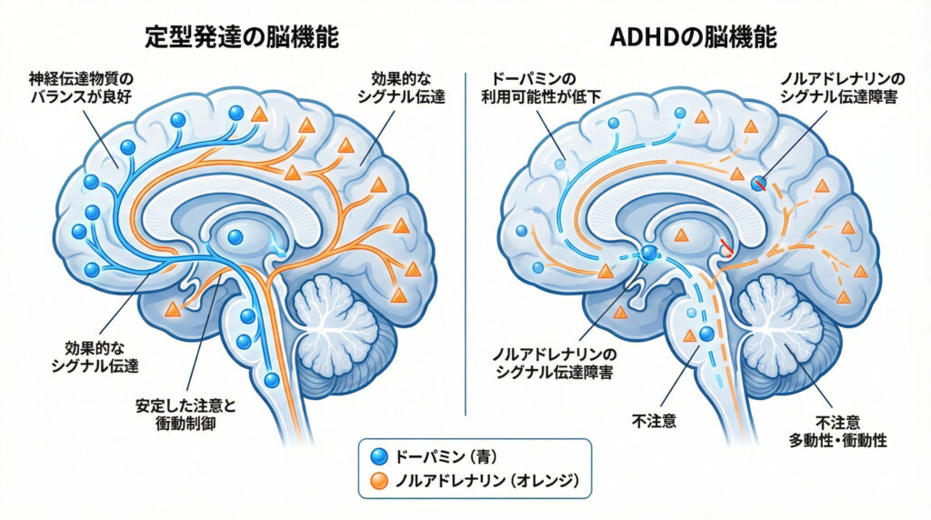 ADHDは正式には「注意欠如・多動症」と呼ばれ、脳の神経伝達物質であるドーパミンとノルアドレナリンの働きが定型発達の方と異なることで生じます。これは生まれ持った脳の特性であり、気合いや根性で治るものではありません。