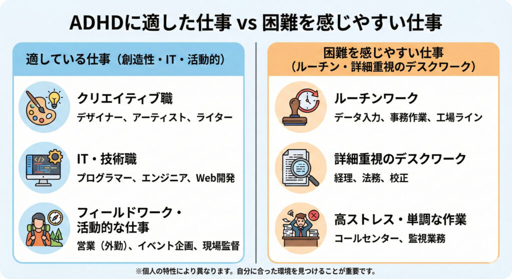 | 多動・衝動優勢型 | 行動力・決断力・フットワークの軽さ | 営業職、配送業、フィールドワーク、接客 |