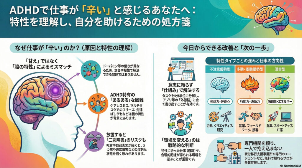 この記事では、ADHDで仕事が辛い方に向けて、なぜ辛くなるのかを脳科学的に解説し、今日から実践できる具体的な改善策7選、「今の仕事を続けるか環境を変えるか」を判断するチェックリスト、頼れる支援機関の一覧まで、徹底的にお伝えします。
