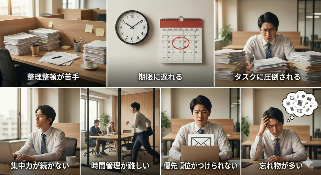ADHDの方が「仕事ができない」と感じる場面には、特性ごとに共通するパターンがあります。