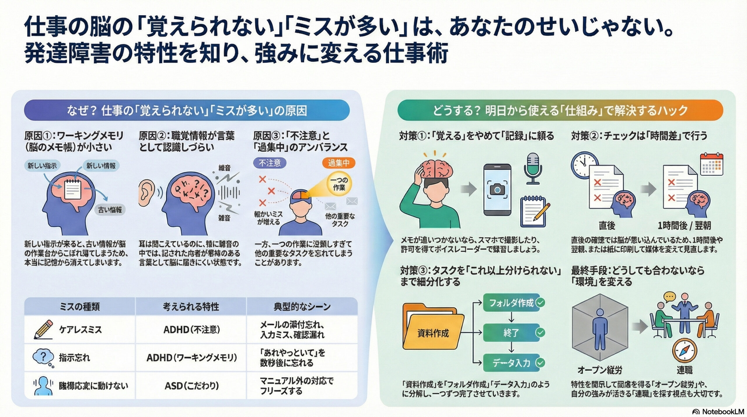 発達障害で「仕事が覚えられない・ミスばかり」なのはなぜ?脳の特性を知り、明日から楽になる20の具体策