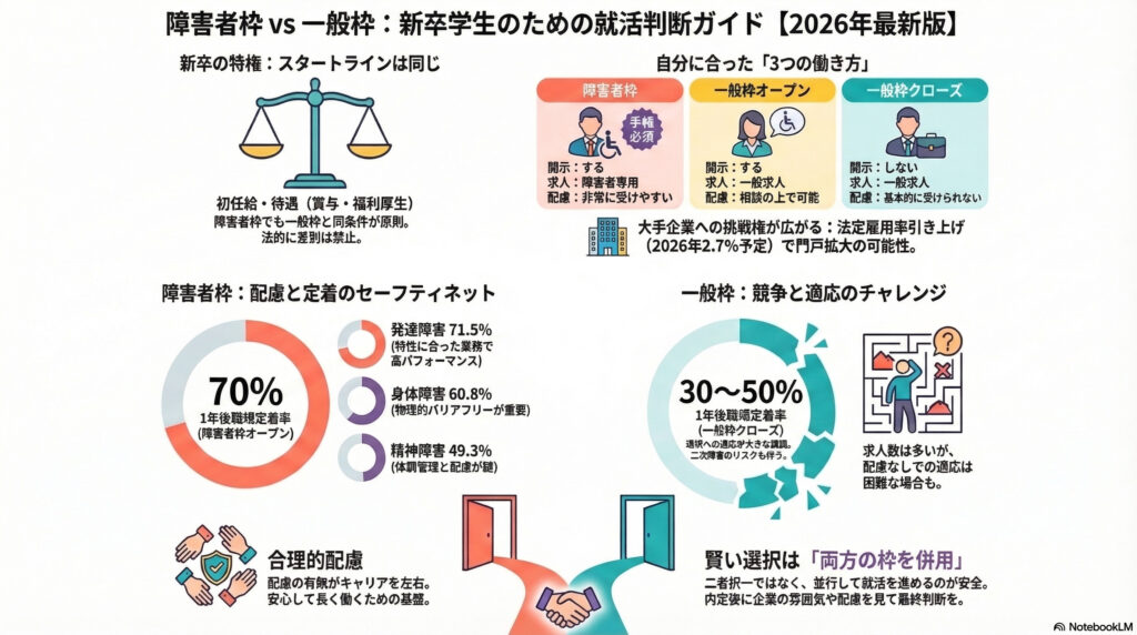障害者手帳を持つ新卒学生にとって、これは就活の最初にして最大の悩みではないでしょうか。障害者枠なら配慮を受けながら働けるけれど、求人が少なくて給料も低そう。一般枠なら選択肢は広いけれど、障害を隠し続けるストレスが心配——。ネットで調べても転職者向けの情報ばかりで、新卒の自分にはどう当てはまるのか分からない、という方も多いはずです。