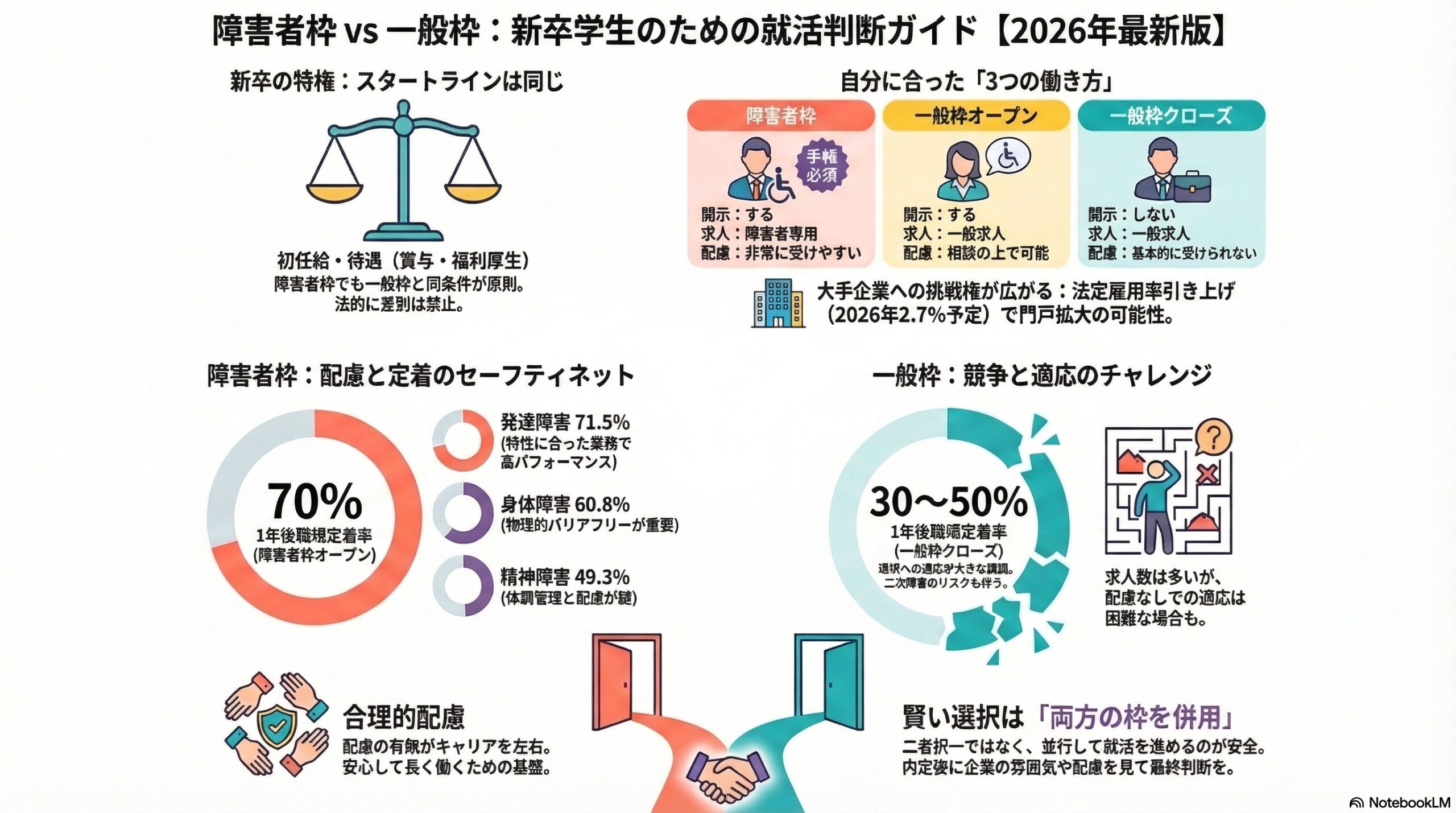この記事では、障害のある新卒学生の視点に特化して、障害者枠と一般枠の違い、それぞれのメリット・デメリット、そして「あなたの場合はどちらが合うか」を判断するためのチェックリストまで、すべてを解説します。