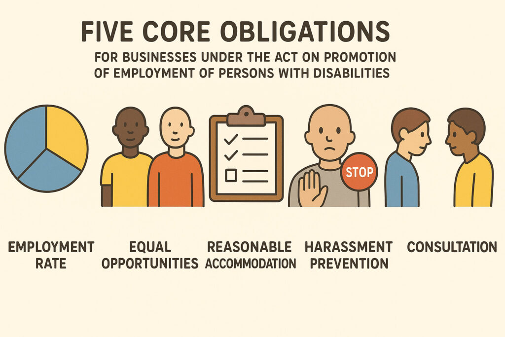 障害者雇用促進法では、事業主(企業)に対して、主に以下の5つの義務を定めています。