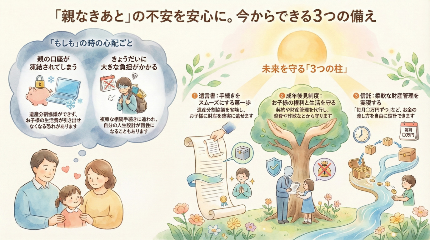遺言書を1通残しておくだけで、お子様が遺産分割協議という高いハードルを越えずに済みます。専門家の力を借りる準備をしておけば、きょうだい児の未来も守れます。