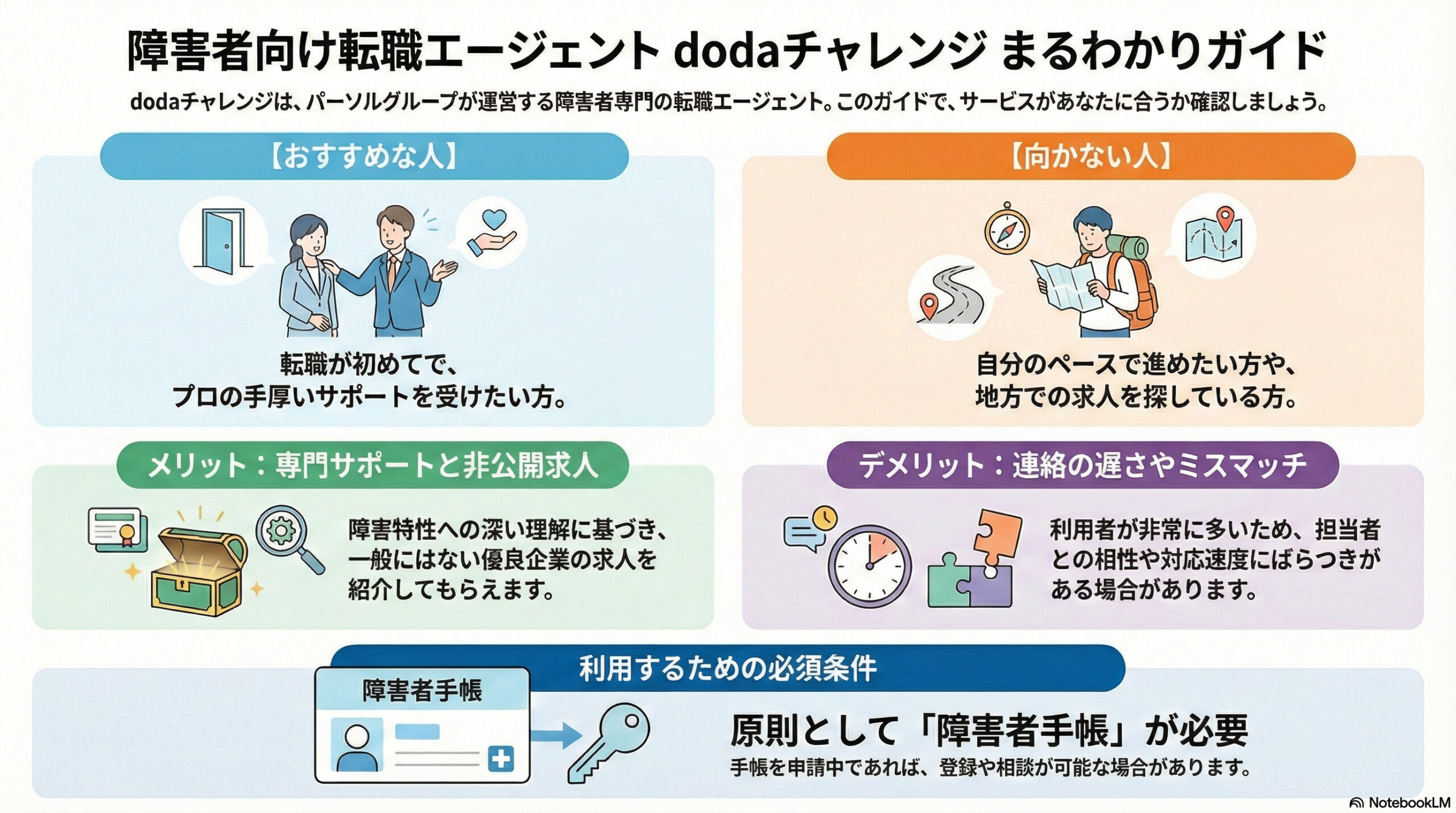 dodaチャレンジは、人材業界大手であるパーソルグループが運営する障害者専門の転職エージェントです。豊富な求人数と手厚いサポートで多くの支持を集めていますが、利用するには「条件」や「コツ」があるのも事実です。