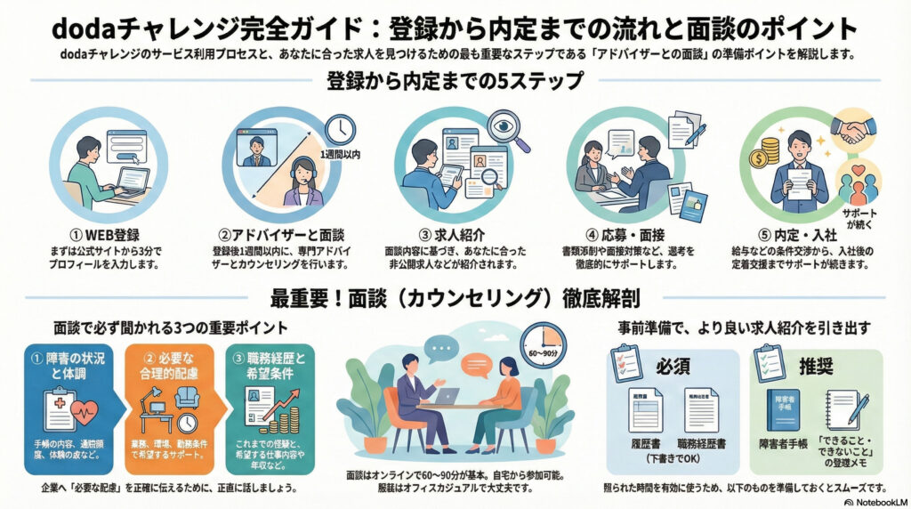 dodaチャレンジの最大の特徴は、障害者雇用に精通したアドバイザーによる丁寧なヒアリングです。ここでは、面談の形式や具体的な質問内容を深掘りします。