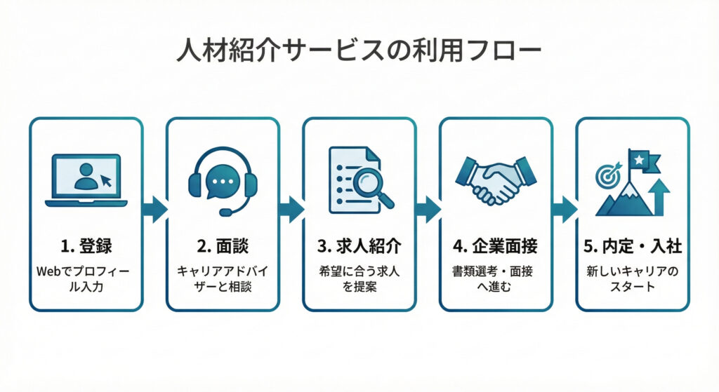 まずは、dodaチャレンジに登録してから就職・転職が決定するまでの全体的なフローを確認しましょう。基本的には以下の5つのステップで進みます。