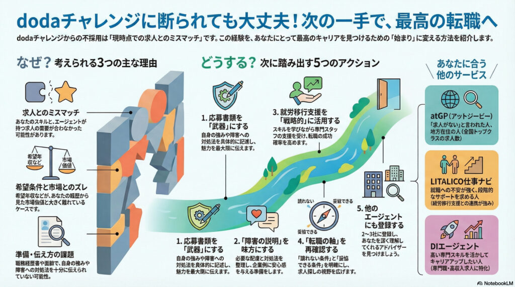 この記事では、dodaチャレンジに断られてしまったあなたが、ショックから立ち直り、自信を取り戻し、そして「自分にとって本当に最適な転職」を実現するための具体的な方法を、一つひとつ丁寧に解説していきます。