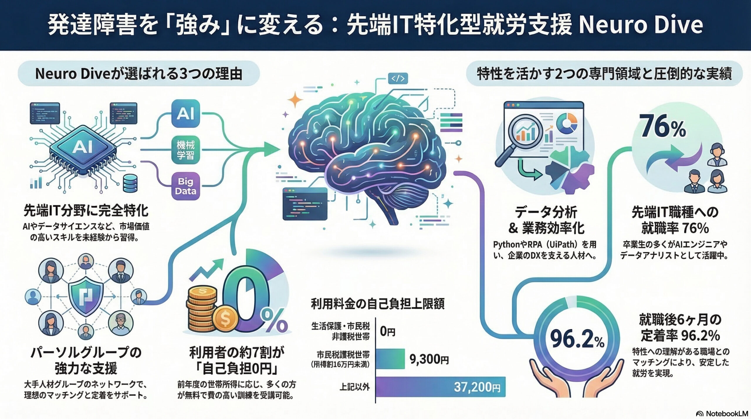 | Neuro Dive | 発達障害への深い知見が最大の強み。特性理解とITスキルを掛け合わせた支援が充実。パーソルグループのネットワークも魅力。 |