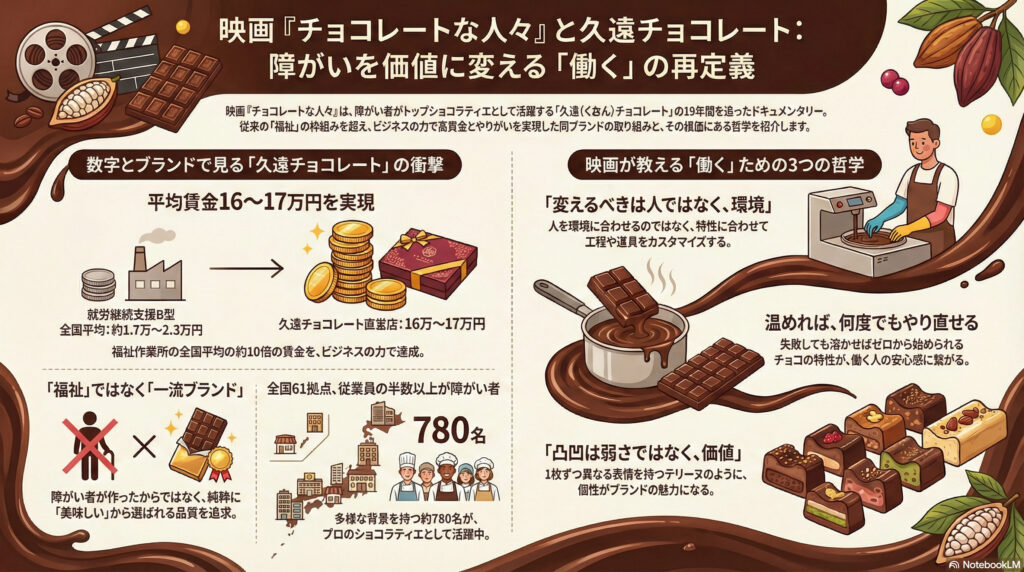 この映画は、「かわいそうな人たちを応援しましょう」という話ではまったくありません。凸凹のある人たちが本気でチョコレートを作り、本気で稼ぎ、本気でぶつかり合う。その生々しくも温かい日々を、19年にわたって追いかけたドキュメンタリーです。