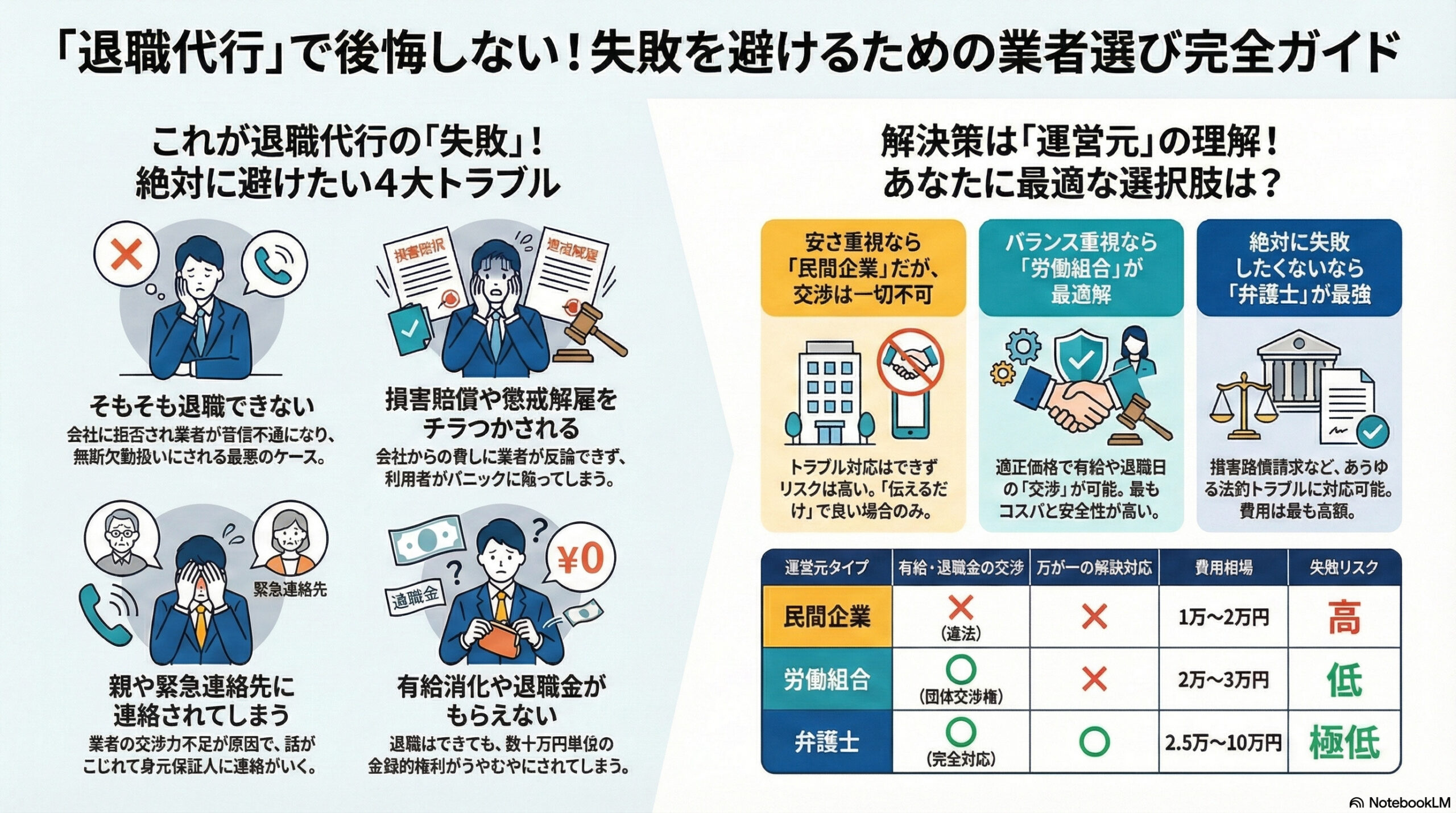 民間業者のサイトで「円満退職」「交渉します」と書いてある場合は、誇大広告か非弁行為のリスクがあります。