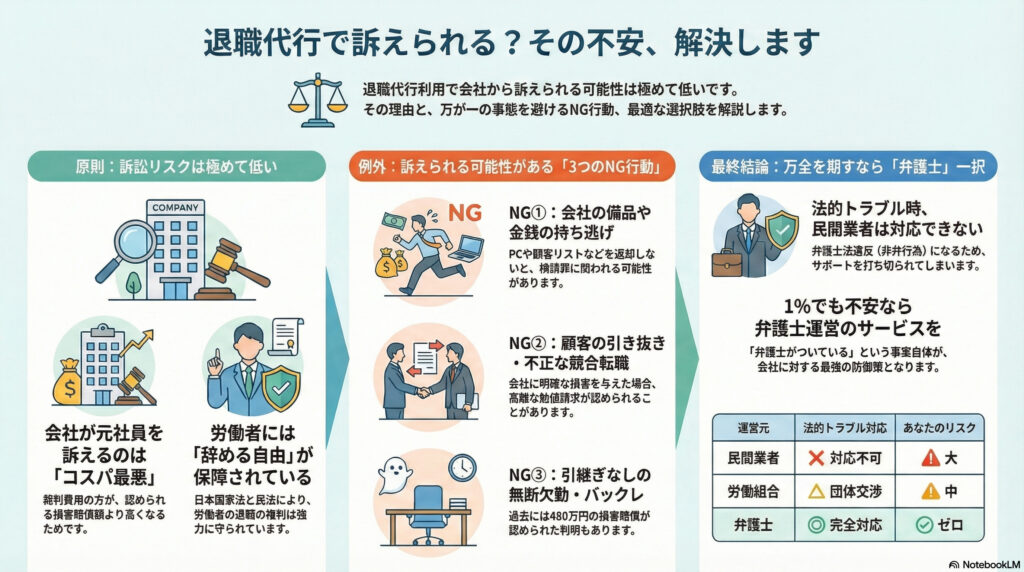 「退職代行を使って、もし会社から訴えられたらどうしよう……」