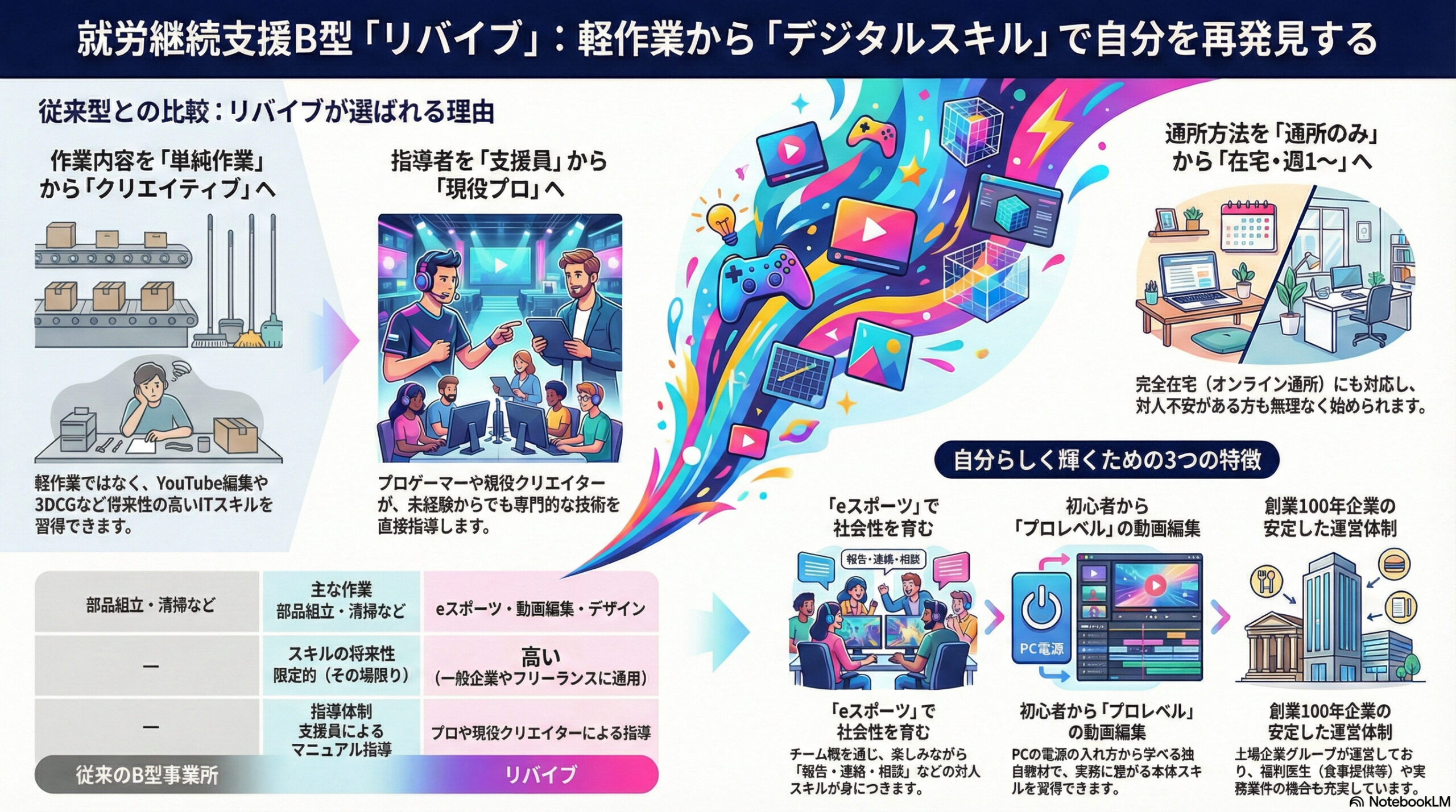 「B型事業所なんてどこも同じでしょ?」ーーそう思っている方にこそ知ってほしい決定的な違いがあります。リバイブは、従来の「作業所」のイメージを覆す、次世代型の事業所です。