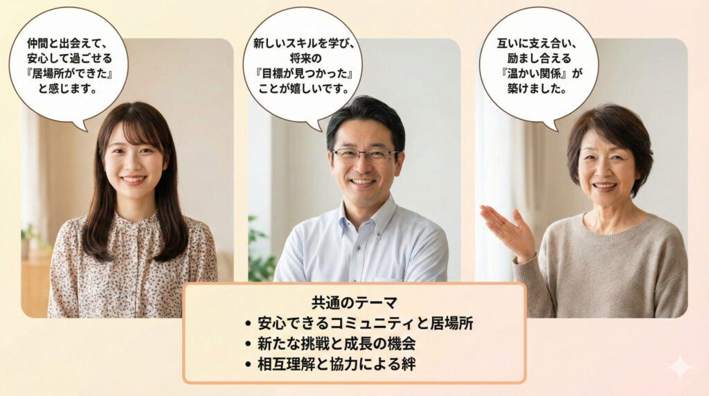 「なんとなく」通い始めた方が、動画編集やイラストなどの具体的な目標を見つけ、前向きな気持ちを取り戻しています。