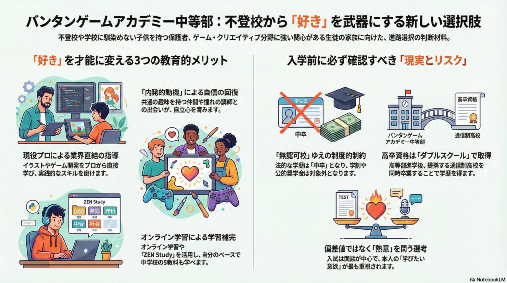 バンタンゲームアカデミー中等部は、単なる「ゲームの習い事」ではありません。既存の教育システムに馴染めなかった親子が、「好き」を武器にして社会と再接続するためのサードプレイスです。