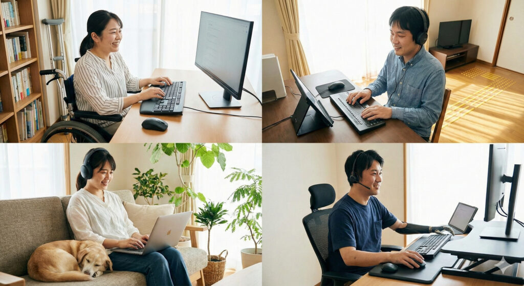 身体障害のある方にとって、在宅就労は通勤の身体的負担を大幅に軽減できる働き方です。車椅子利用者や移動に介助が必要な方でも、在宅であれば自分の体に合わせた環境で仕事ができます。