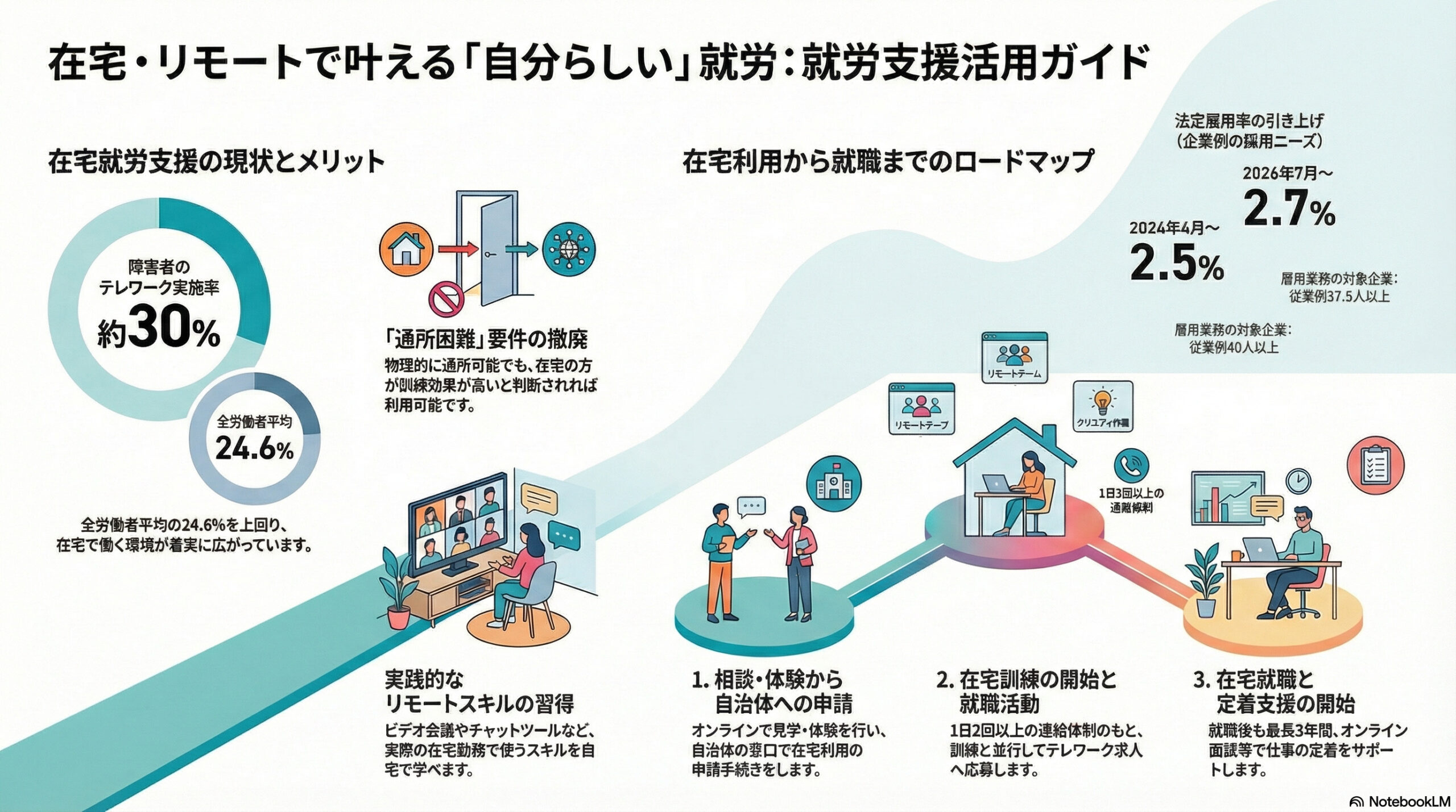 本記事では、こうした追い風の中で在宅・リモートの就労支援をどのように活用すれば良いか、制度の基礎知識から実践的な活用法まで網羅的に解説していきます。